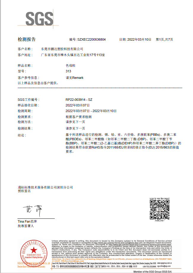 和鵬達(dá)塑膠科技有限公司合作很長一段時(shí)間了,他們的產(chǎn)品質(zhì)量好,服務(wù)到位,且原材料都通過SGS測試符合歐盟REACH,PaHS、ROHS及無鹵指令,備有美國FDA級食品接觸規(guī)格物料,和他們合作完全沒有后顧之憂!